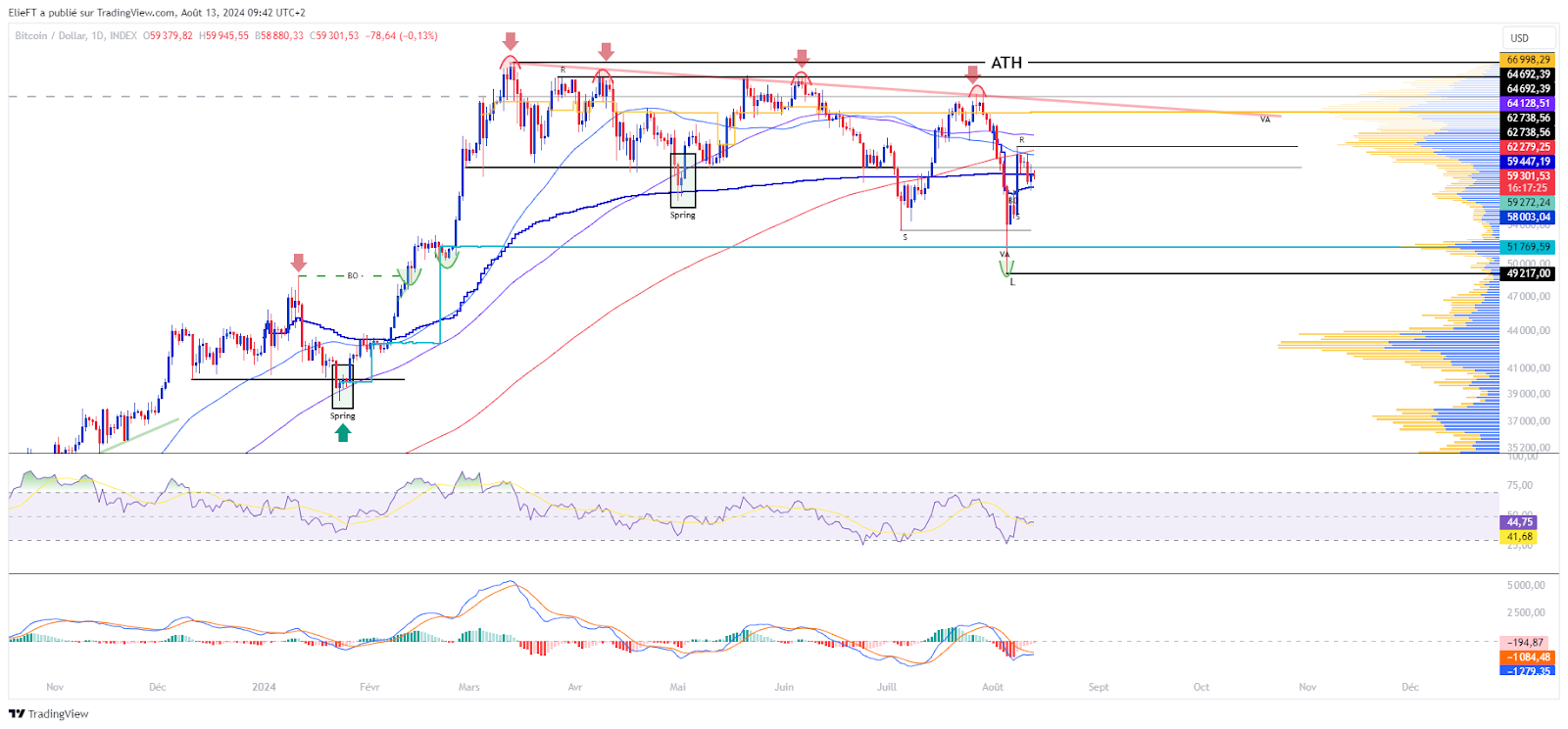 After falling significantly due to fears of a recession in the United States, Bitcoin bottomed at $49,200. It is important to note that this price level corresponded to an area of interest confirmed by an area of significant value. Since then, the flagship cryptocurrency has regained strength, jumping by nearly 28%. Bitcoin thus broke through the psychological threshold of $60,000 and reached a high of $62,800. Unfortunately, this bullish momentum began to wane from this last level, which now acts as resistance.