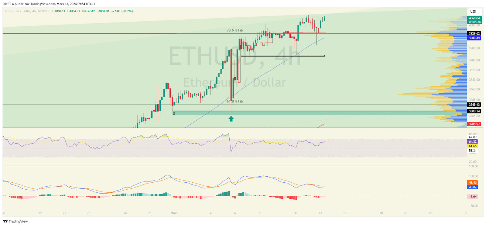 After testing the $3,300 zone, Ethereum price continued its rise, reaching new highs. At the time of writing, one Ether is trading at over $4,000. Thus, the Ethereum price crossed the 78.6% Fibonacci retracement threshold, calculated from its all-time high. In other words, Ethereum is now only a few hundred dollars away from its all-time high. The bullish scenario mentioned in our analysis of March 6 has therefore materialized. Namely, reaching this last level took place following a rebound from $3,700.