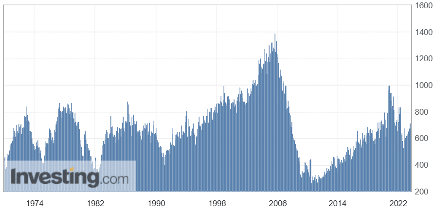 Likewise, most new home sales figures came in above expectations. We can clearly see that the confinements have marked a clear excess on the real estate market. This excess in 2020/2021 seems to have been offset by a symmetrical trough. This dip in the real estate market appears to have been accompanied by a slight drop in prices. Sales of new homes are now holding up, but the upward trend observed since 2011 is clearly affected.