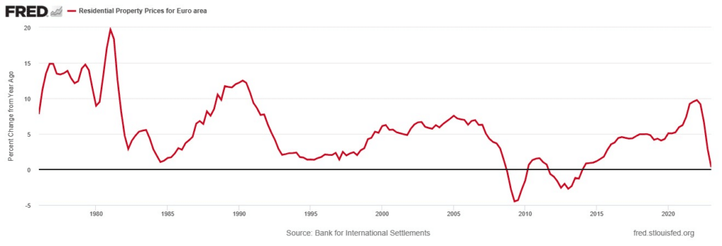 Between the third quarter of 2022 and the first quarter of 2023, the price of residential property in the euro zone fell by almost 2.7%. This drop must be analyzed in detail, because it may be a real bearish reversal. Over one year, property prices are stable in the euro zone.