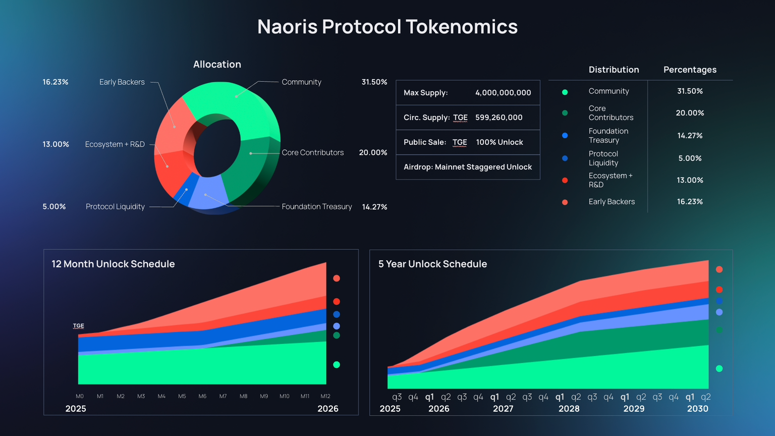 The allowance favors Community (31.5%) and Core Contributors (20%)while the early backers represent only 16.23%. The unlocking calendar is spread over 5 years, avoiding massive dumps and promoting long -term commitment.