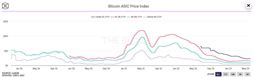 At the same time, the cost of production has recently been the subject of difficulties for miners. The production cost of BTC refers to the expenses incurred by miners to participate in the mining process. As a result, these costs include the purchase of specialized hardware, such as ASICs (application-specific integrated circuits), as well as the electricity costs needed to power these power-hungry machines. The cost of production varies depending on factors such as the geographical location of the miner (which affects electricity costs) and the efficiency of the equipment used. The chart below shows the ASIC price index by hash rate.
