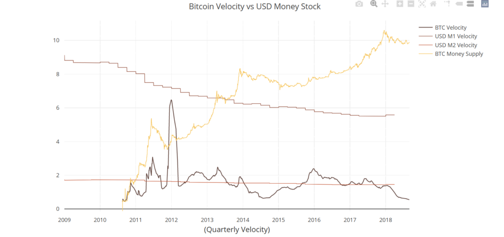 Ultimately, we deduce that the velocity of bitcoin is therefore close to 0.66 in 2022! That is to say, the velocity of bitcoin is lower than that of traditional currencies. But it would also be interesting to study the evolution of this velocity. Over the long term, bitcoin’s velocity remains roughly constant. Its average value between 2010 and 2018 was around 1.4. From where it follows that a velocity lower than 1 is properly weak for the bitcoin.