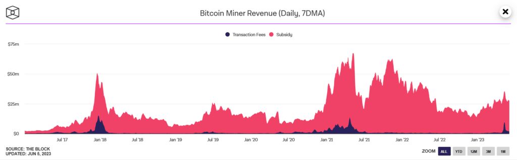 According to The Block, we see that the income received by miners has been fairly stable in recent years. They logically climbed with the bull market of 2021, before reaching a low at the end of 2022. Keep in mind that miners now represent just 5% of the total bitcoin supply. Which is far from the 90% of the first years following the creation of Bitcoin.