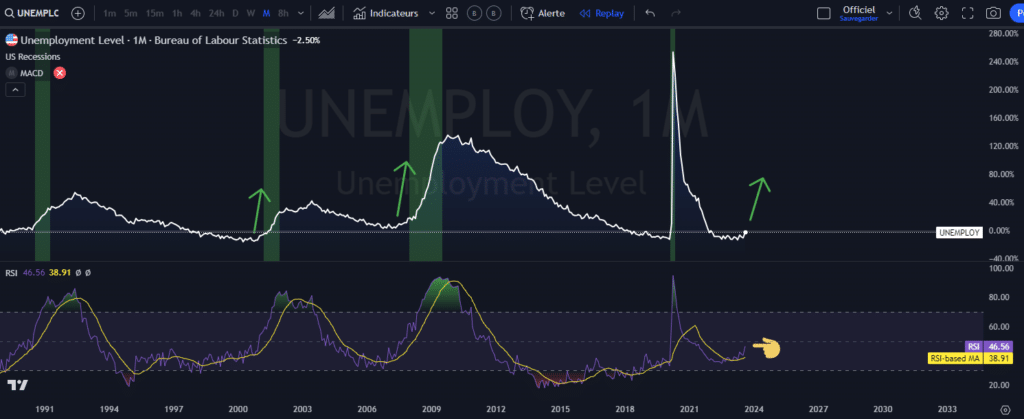 For the moment, the restrictive monetary policy of central banks has already slowed economic growth quite a bit and we do not yet know the full consequences of the rise in rates. Moreover, we can say that the job market is increasingly fragile and that the unemployment level has rebounded slightly. That said, it would take a move above the 50 mark on the RSI indicator to say that we have a trend.