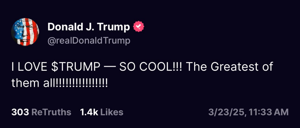 Donald Trump praised the $ Trump token on his Truthocial social network on Sunday morning. At 10:33 am East, he launched a message: ” I love $ Trump! So cool! The best of all !!!!!!!!!!!!!!“”
